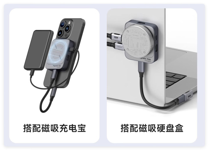 除了折中单个转接头之外,那么多扩展坞里面,我比较喜欢的是海备思那种磁吸式的。
